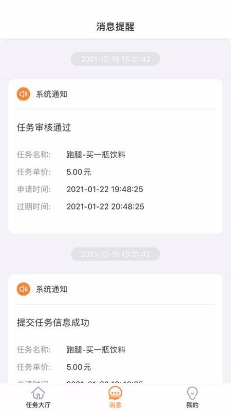 5、支持接收多种消息提醒,消息中心展示自己任务审核通过或提交任务信息成功的提示;